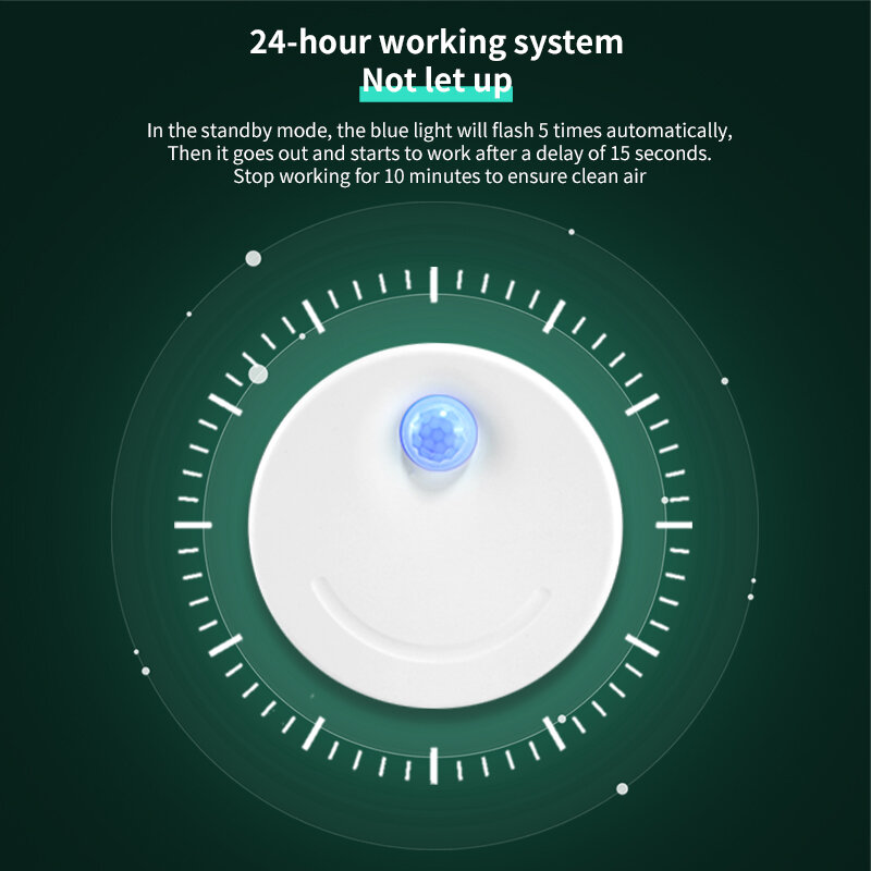 ● 24 - hour workdayIn standby state, the blue light will flash for 5 times and then turn off. It will start working after 15 seconds and stop working after 10 minutes to ensure clean air.